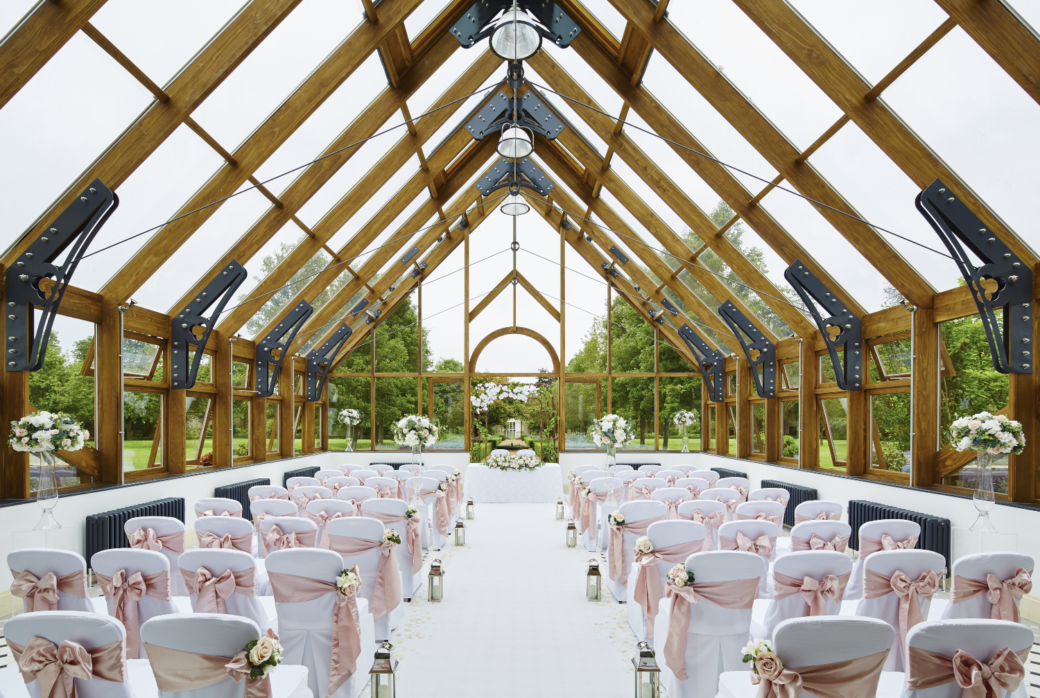 Set in the picturesque landscapes of Hertfordshire, Hanbury Manor Marriott Hotel & Country Club is a 19th century Jacobean-style manor located in Ware, only 25 miles north of Central London. Wood-panelled libraries, cosy fireplaces and charming guest rooms are a reminder of the quiet sophistication of a time gone but not forgotten. The 200-acre estate features 161 bedrooms and suites, an 18-hole golf course designed by Jack Nicklaus II, a leisure club and spa, two dining outlets and a bar, 14 meeting and event spaces and an abundance of countryside strolls. Venues and Capacity Both licensed for civil ceremonies, choose from two distinct venues, Poles Hall & Thundridge Suite and Garden Court & Summer House, where historic charm and modern facilities blend seamlessly. Poles Hall & Thundridge Suite: Once the chapel of the manor house, Poles Hall is full of character, with stunning vaulted ceilings and a minstrels' gallery. Poles Hall can comfortably accommodate up to 120 guests for your ceremony and seated dinner and up to 150 for your evening reception. Garden Court & Summer House: Enchanting no matter the season, Garden Court and Summer House offer a light-filled venue featuring 27 guest rooms. Enclosed in a romantic walled garden, this is the ideal setting for a more exclusive occasion. Garden Court & Summer House can comfortably accommodate up to 70 guests for your ceremony, up to 80 for your seated dinner and up to 120 for your evening reception. Prefer to host your ceremony outdoors? Between May and September, choose to host your ceremony outside within our walled garden and dance the night away in Summer House. Speak to our team to learn more. Services Offered From a small, charming wedding, to a large, extravagant party— Hanbury Manor Marriott Hotel & Country Club is the perfect back-drop. Couples will work alongside a dedicated wedding expert, who will be happy to take care of all the arrangements. Catering is managed by the in-house team for added convenience.Catering